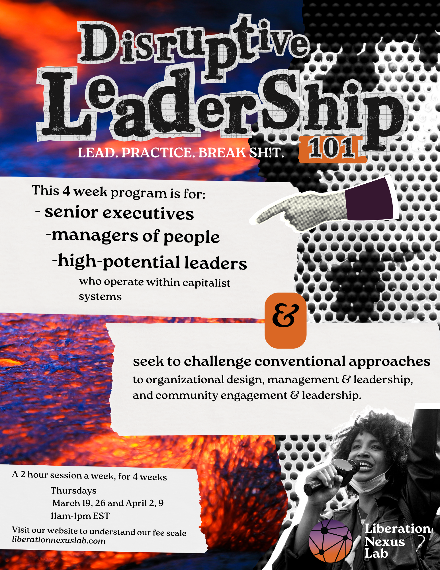 Disruptive Leadership 101 is a four-week program designed for forward-thinking executives and emerging leaders who seek to challenge conventional leadership paradigms while maximizing impact within inequitable capitalist systems.