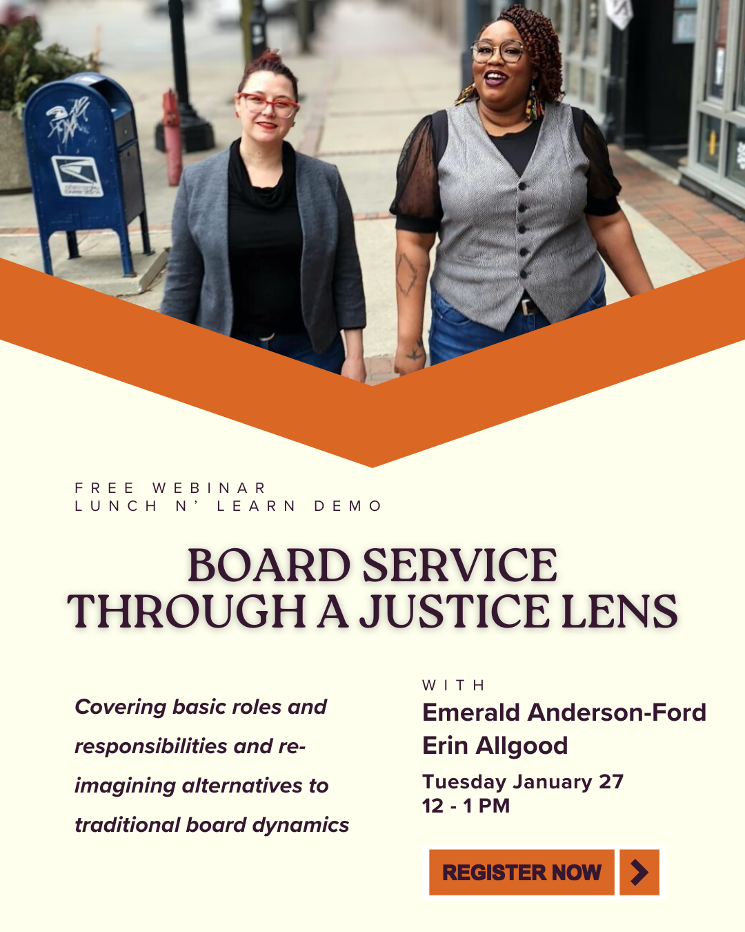 Explore a demo of our 'Board Service Through a Justice Lens' offering during your lunch! Hosted by co-founders Emerald Anderson-Ford and Erin Allgood. We'll be covering basic roles and responsibilities and re-imagining alternatives to traditional board dynamics.